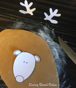 - Once you have printed you little Reindeer I cut him out & cut of his antlers & rolled out my Teddy Bear Brown fondant and using a sharpe knife I cut around the paper template.